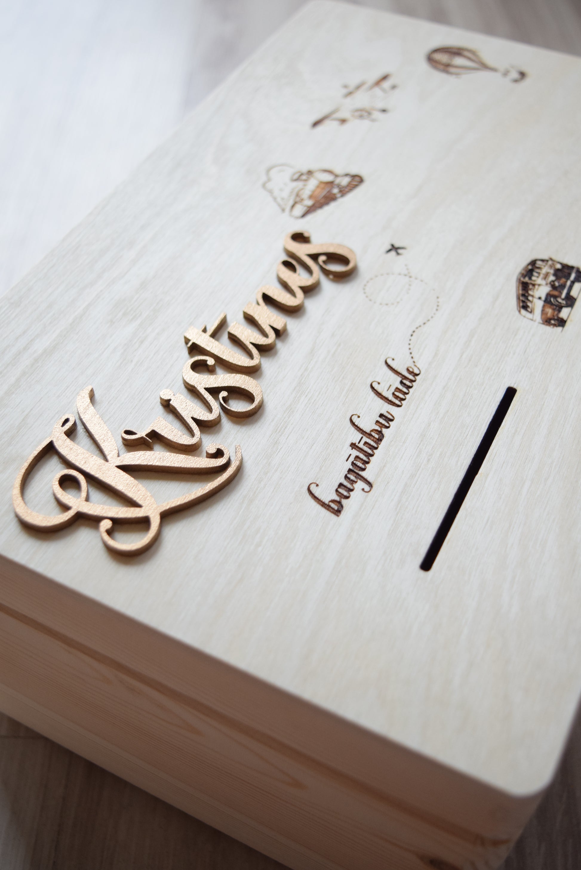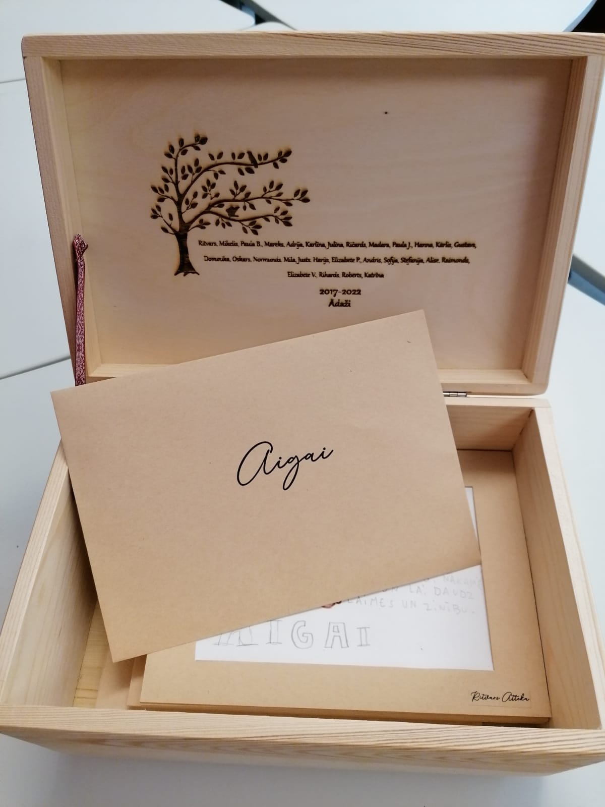 Tekstu uz lādes vari izvēlēties gan lāzerdrukā, gan 3D formātā.Par papildus iekšējā vāka druku raksti mums privāti!
